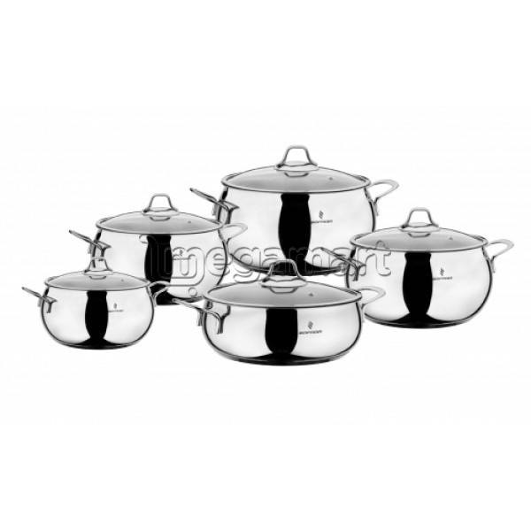 | Описание | 18 см глубокая кастрюля - 2.3 л. 20 см кастрюля - 3.3 л. 22 см кастрюля - 4.5 л. 24 см кастрюля - 6 л. 24 см сотейник - 3.3 л. Полированная поверхность Нержавеющая сталь 18/10 Cr-Ni |